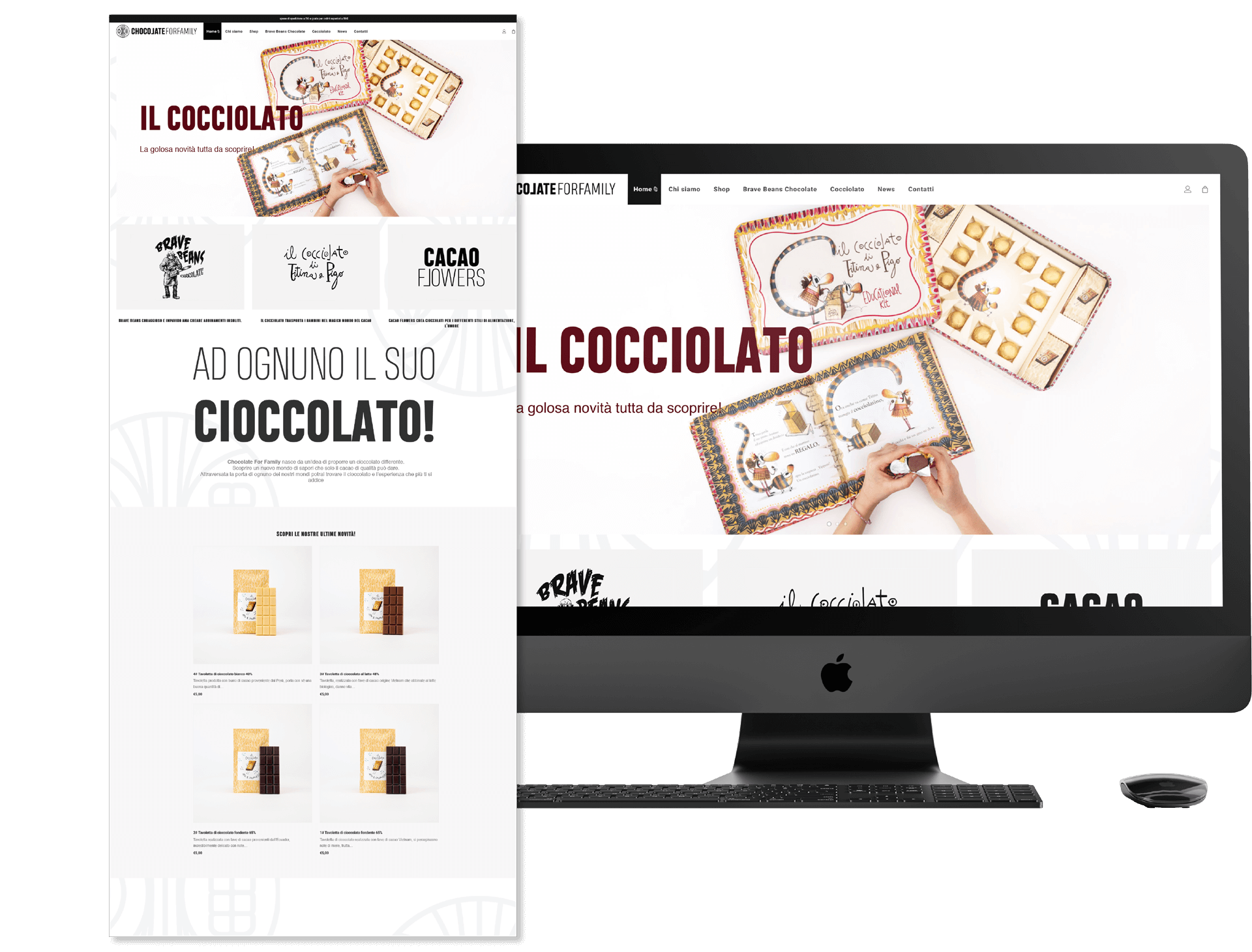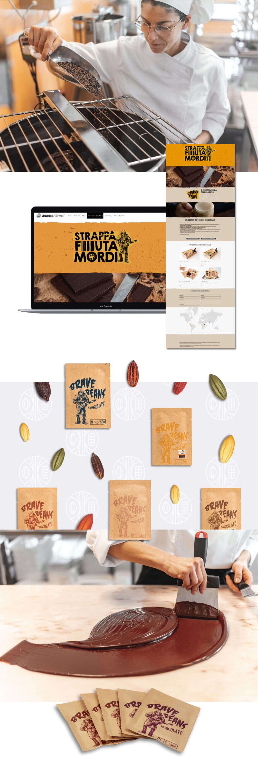 Per farlo è stata creata una grafica diversa per ogni sezione del sito, una più dolce, colorata e divertente per la sezione “Il Cocciolato”, dedicato a famiglie e bambini, e una più ruvida e decisa per la linea “Brave Beans Chocolate”, dedicata al cioccolato d’abbinamento per gli amanti della birra.